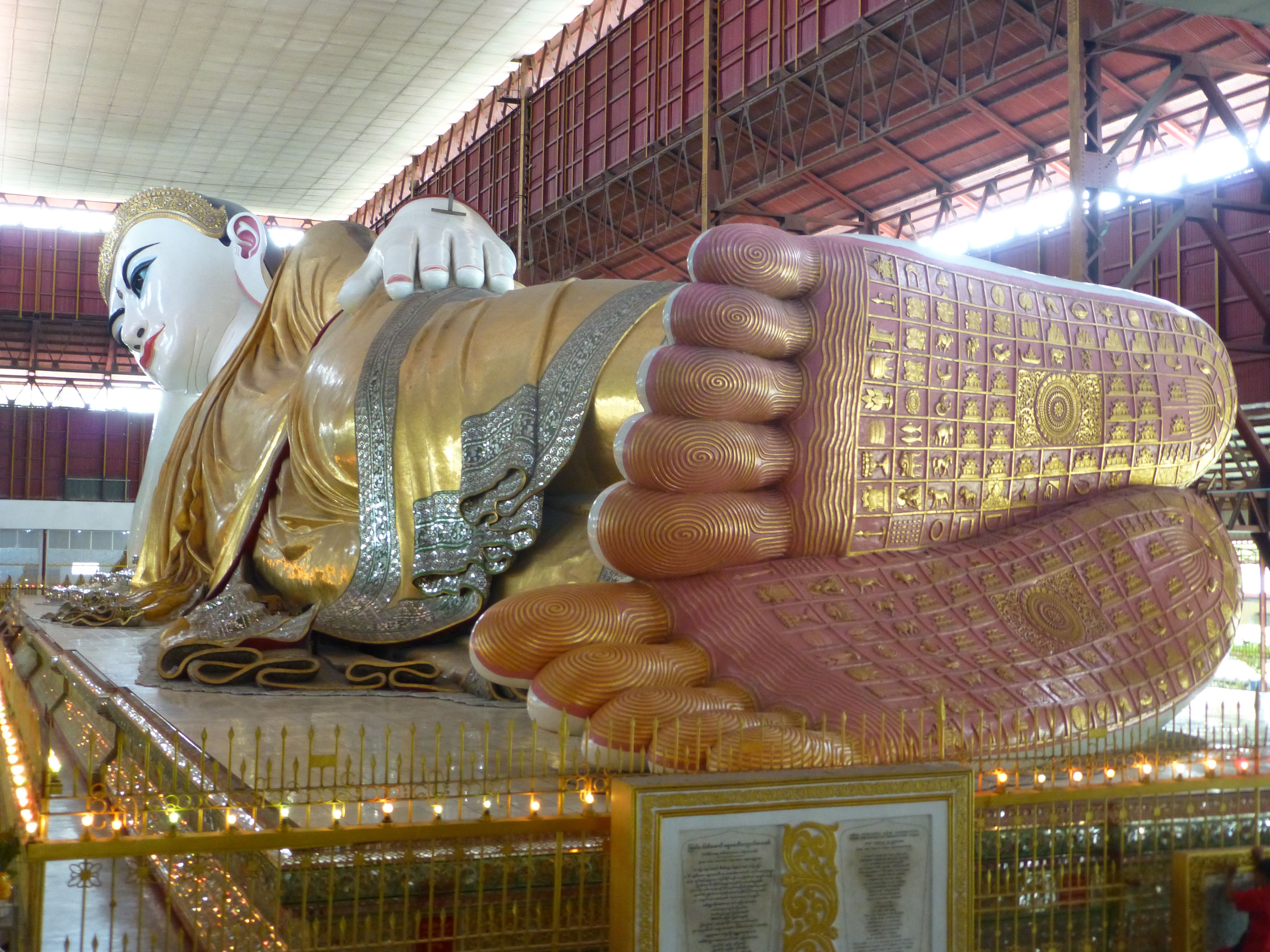 Apres avoir enfin trouve un taxi – en effet les trois premiers ont refuse de me conduire la-bas ou alors ils n avaient pas comrpis ou je voulais aller, et ce n est que lorsqu un local m a aide que j ai trouve un taxi – j arrive a la Paya Chaukhtatgyi, ou se trouve une statue de Bouddha couche d environ 80m.