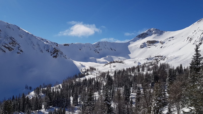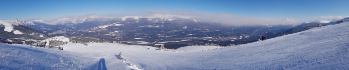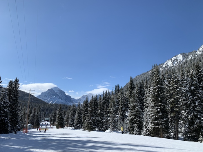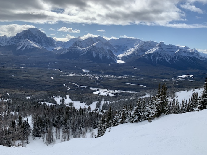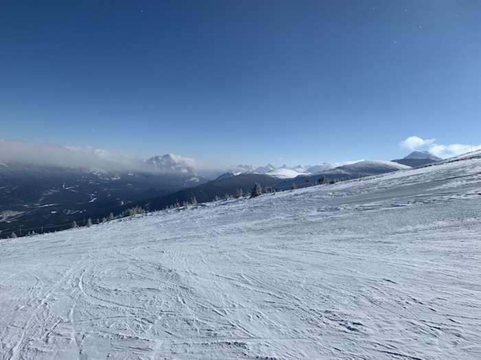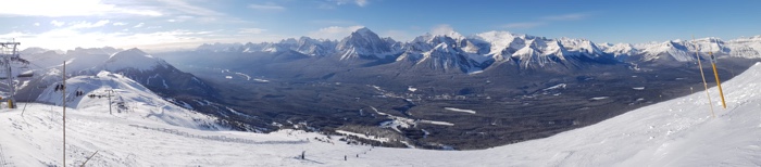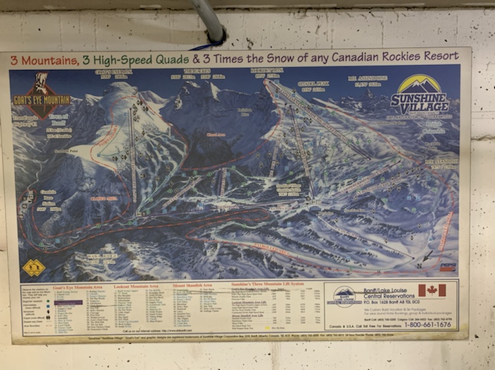 J ai beaucoup de plaisir à découvrir la station. Cela fait une sorte de demi cercle avec 3 sommets, un grand cirque blanc, avec un télésiège qui va sur chaque versant. En tout il doit y avoir 6 télésièges, dont aucun avec bulle. Étonnant. Enfin pas tant que ça si on considère qu il y a des sièges pour deux et que la majorité n ont pas de repose pieds. C était déjà comme cela a Banff. Mais la ba il y avait un télésiège chauffant à bulle. C était le luxe.