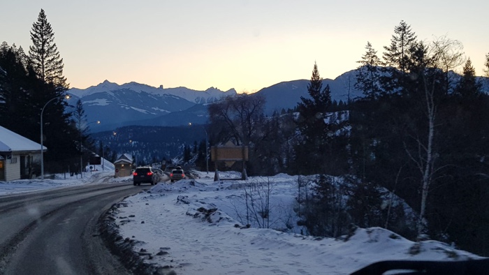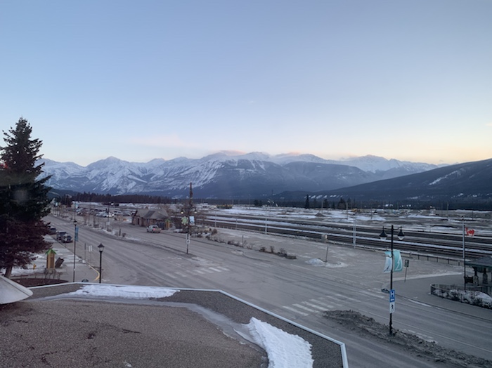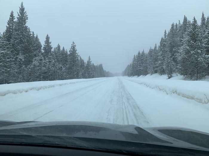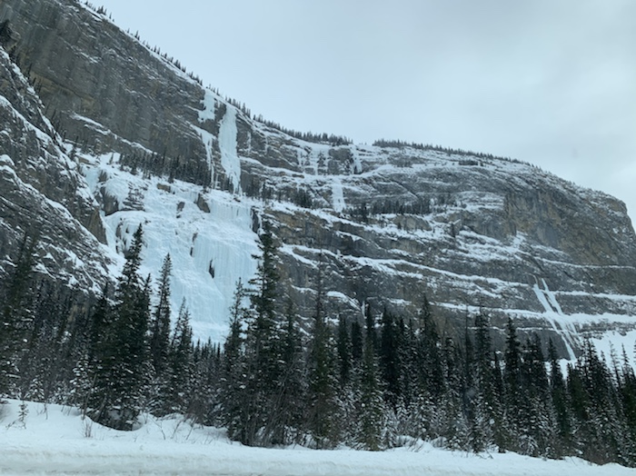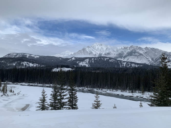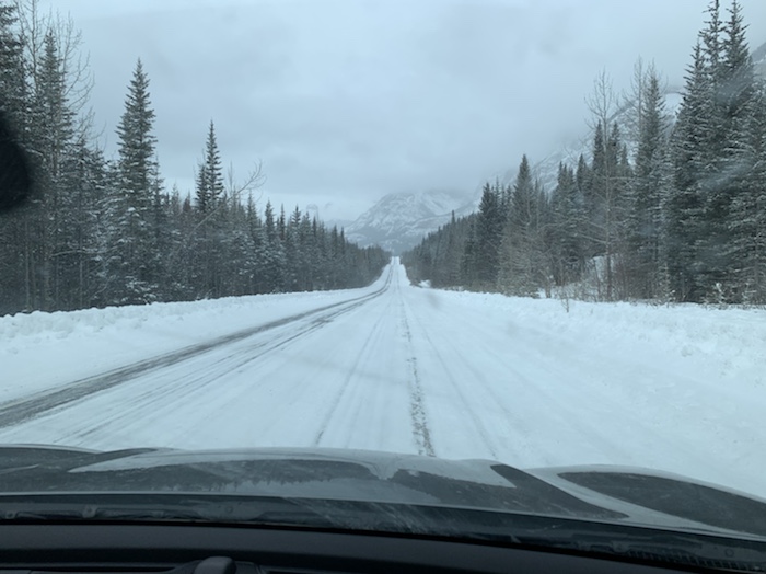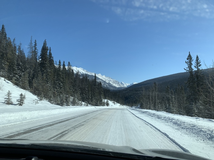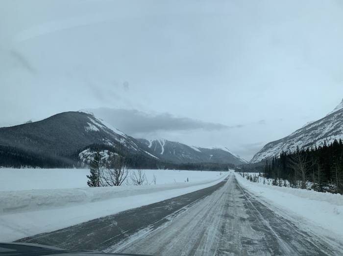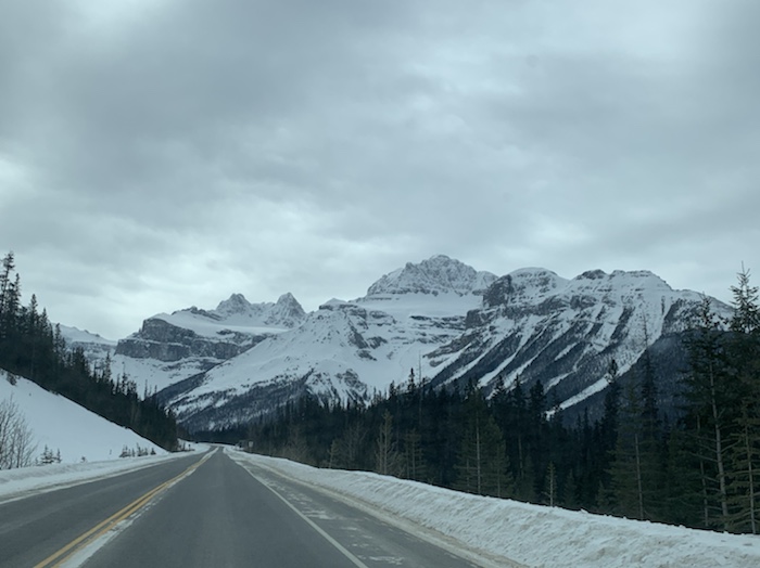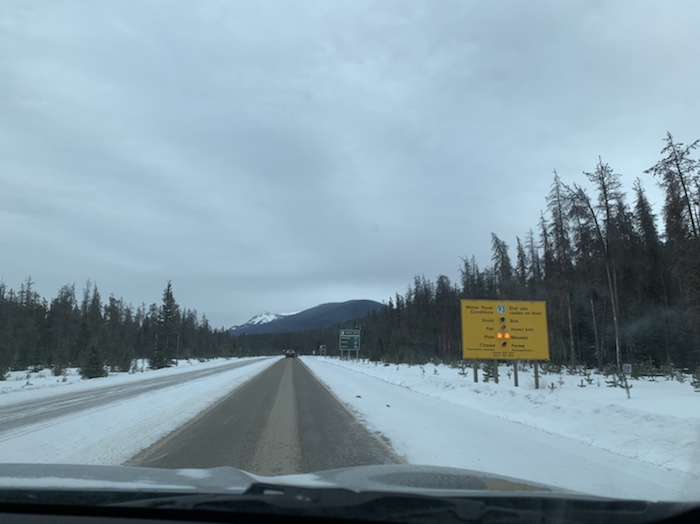 Après une matinée tranquille à l hôtel, nous nous mettons en route pour Jasper. Au réveil le ciel était gris mais gentiment je vois les montagnes et un peu de ciel bleu. Une légère pellicule blanche recouvre les routes.