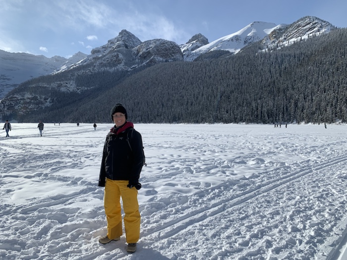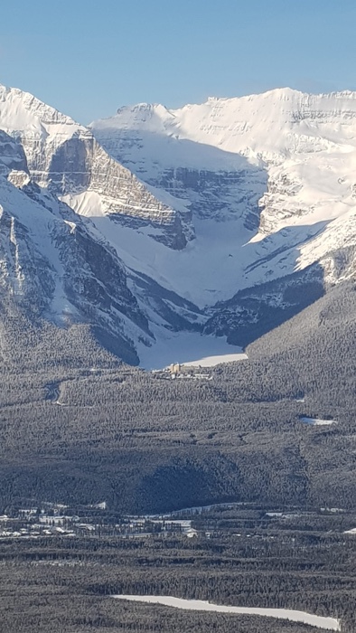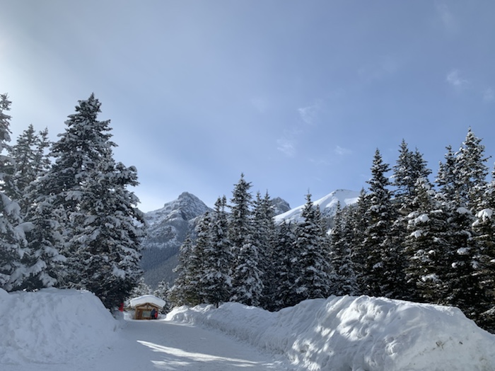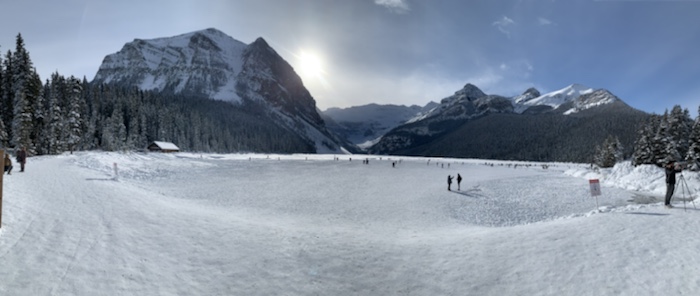 Soleil pour notre balade. Traversée du Lake Louise et vue grandiose.