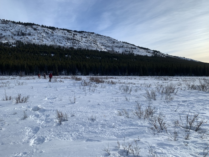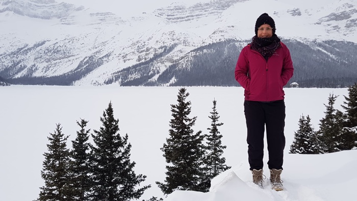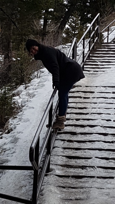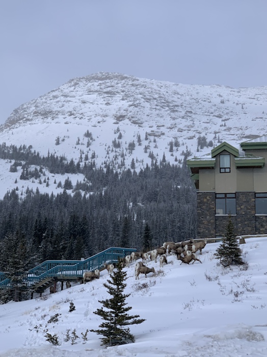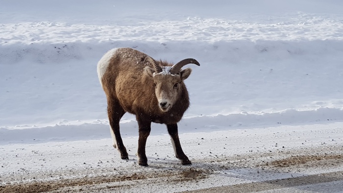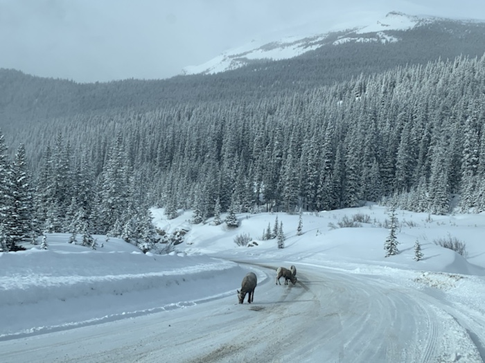 Pause pique nique dans la voiture au Glacier d Athabasca puis petite balade, mais d abord il faut s équiper. Il fait -15 aujourd’hui. J espère que le ciel va se dégager et que nous pourrons voir le glacier, le soleil n étant pas loin. Au final pas de glacier mais des mouflons.
