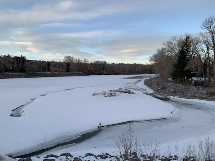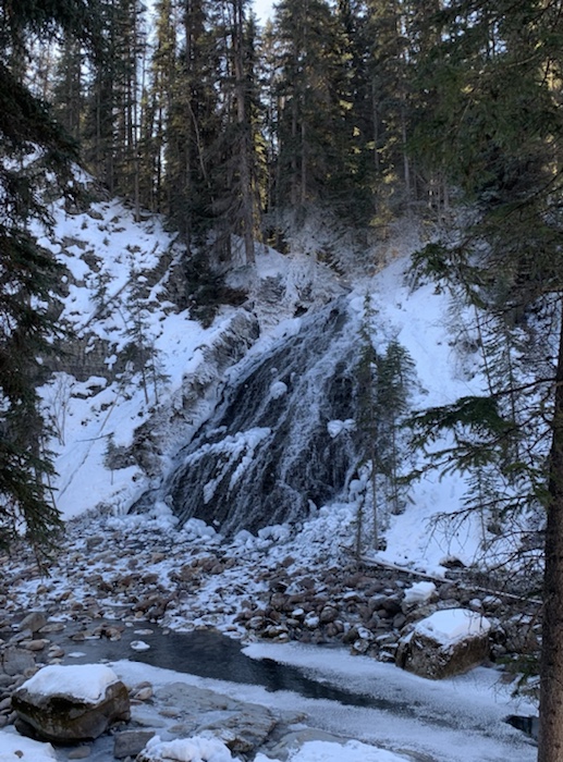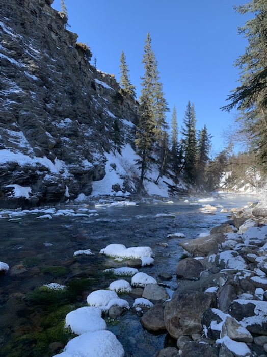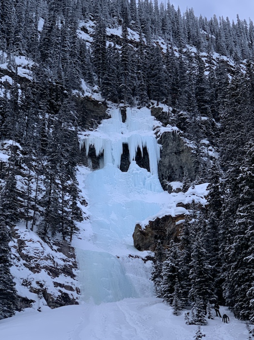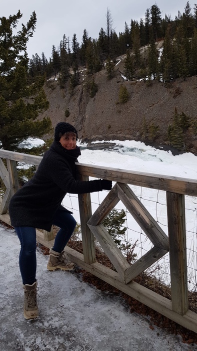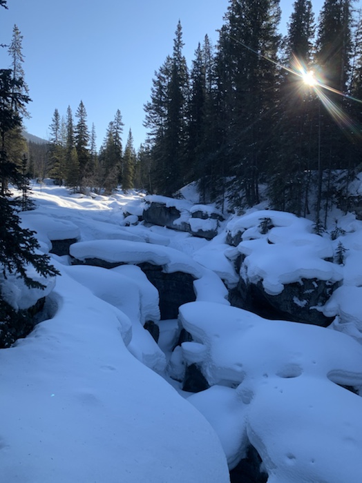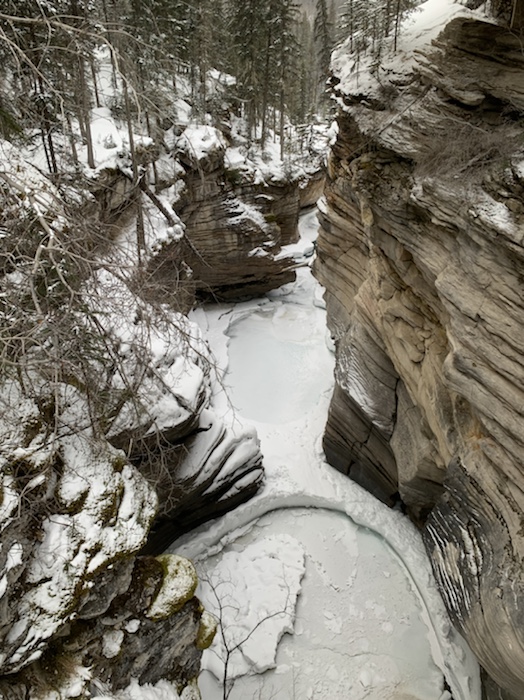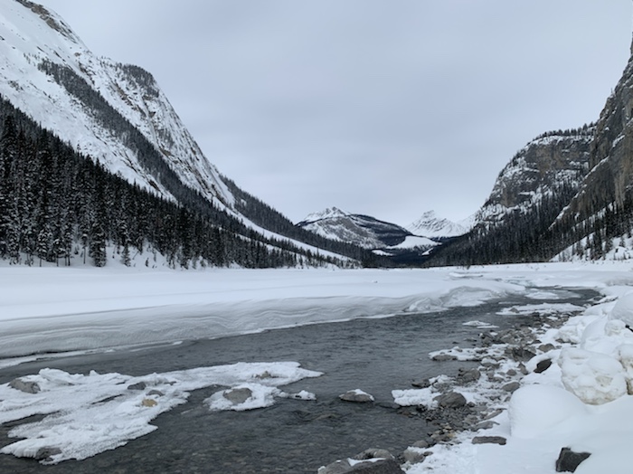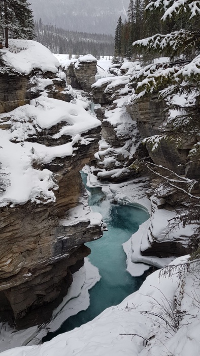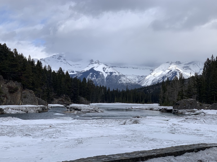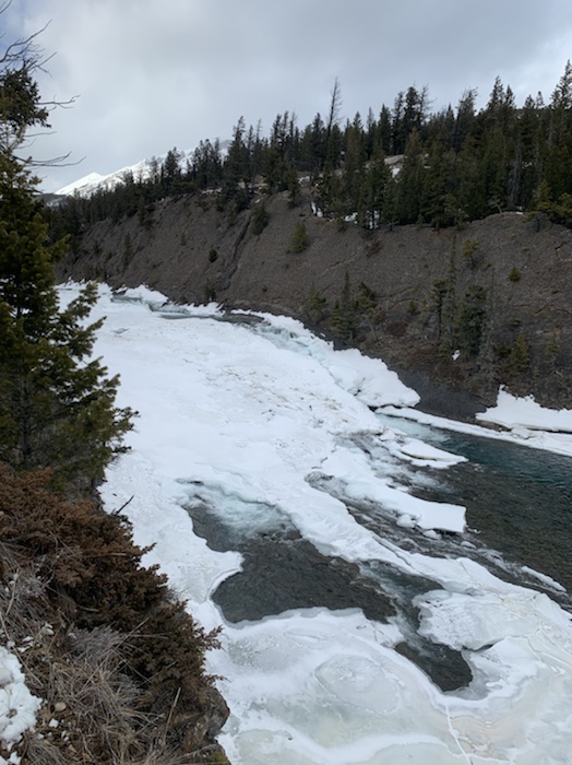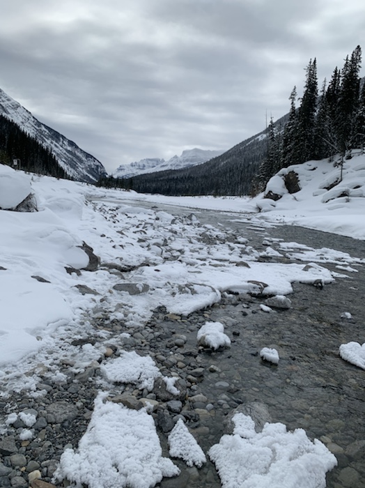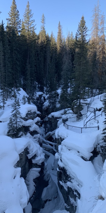 Une fois les bagages déposés à l hôtel, nous partons en balade. Nous descendons l avenue principale de Banff. Il y a des magasins partout, puis nous suivons la Bow River car nous voulons voir les chutes. Le chemin est un peu glacé et les chutes assez petites par contre la couleur de l eau en contraste avec les rives gelées et les arbres c est très beau. Et surtout à la fin la vue s ouvre sur une magnifique vallée avec les montagnes derrière.