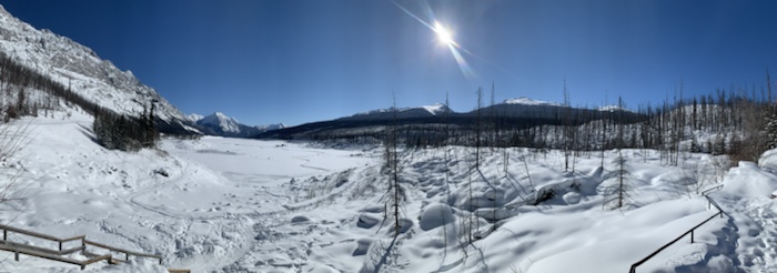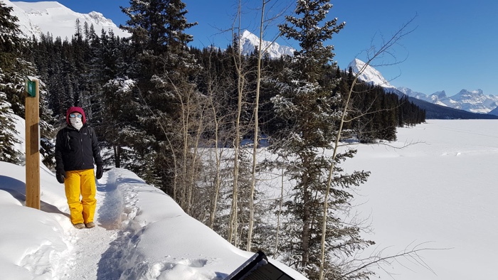 Comme nous sommes déjà sur la route, nous décidons d aller jusqu’au lac Maligne et d y faire une petite balade. Il fait moins 21 mais le soleil réchauffe un peu. Nous longeons le lac avant de passer dans la forêt. La boucle fait un peu plus de 2km. Il y a un petit duvet de neige fraîche. C est beau.
