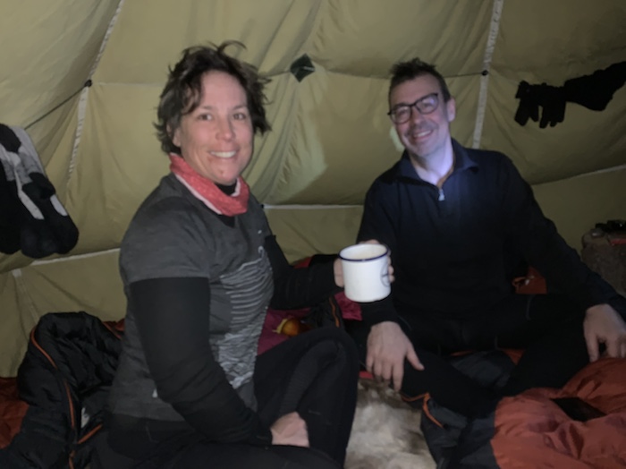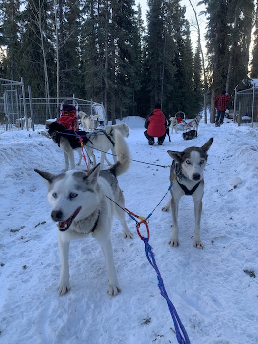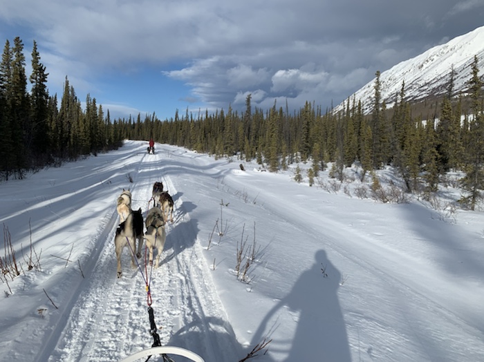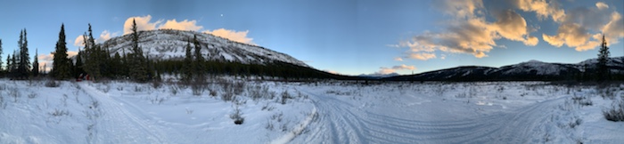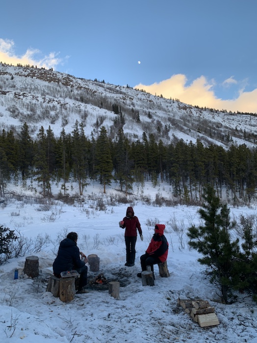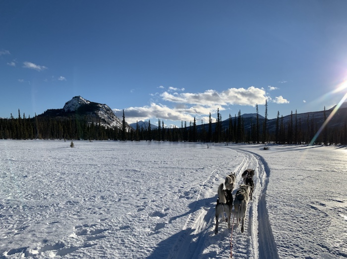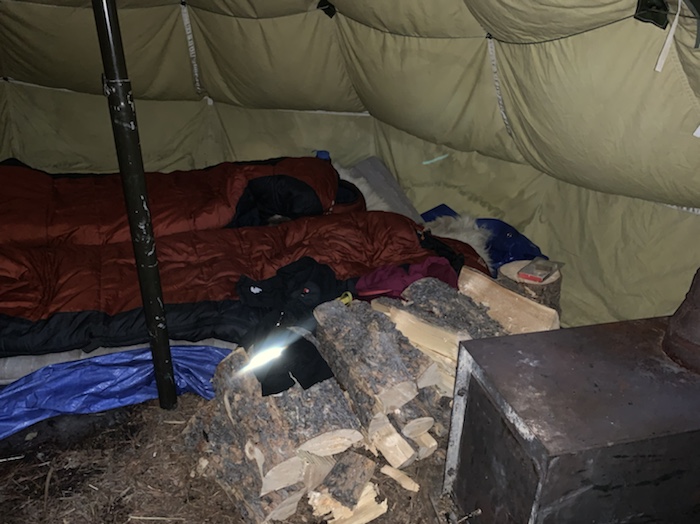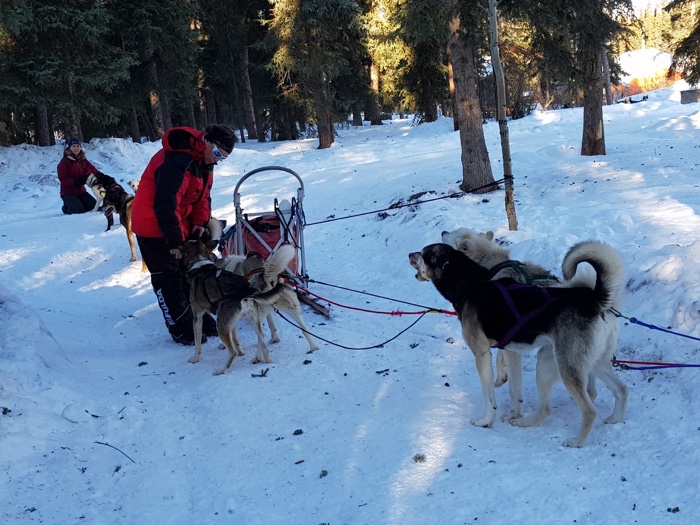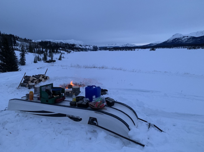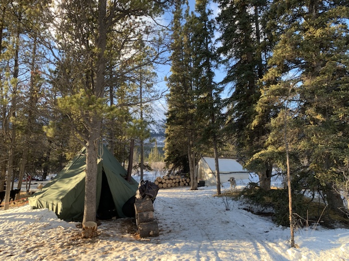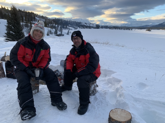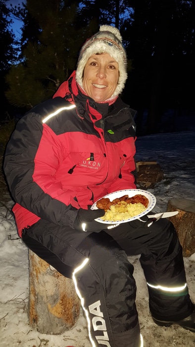 Les journées passent tranquillement. On se lève vers 8h30, car avant il ne fait pas jour, on déjeune tranquillement dans la tente, on dit bonjour aux chiens, éventuellement on prend les raquettes pour partir à la recherche de l orignal, on prépare les traîneaux puis on fait un tour avec les chiens d environ 4 heures et on revient au campement où on se met autour du feu avec un thé et des biscuits. Nous partageons cette aventure avec Marlène une canadienne de BC. Le soir nous soupons autour du feu et finalement vers 21h30, après une journée en extérieur, on est au lit. Je ne pensais pas faire des « nuits » de 11 heures.