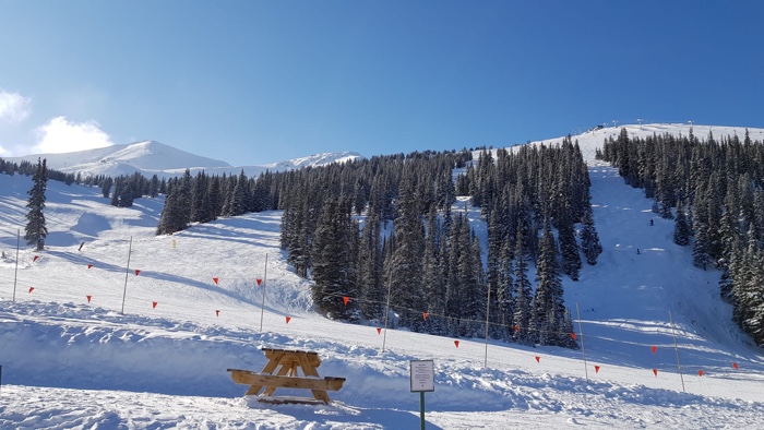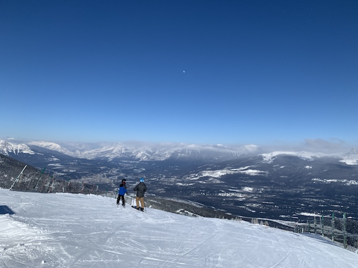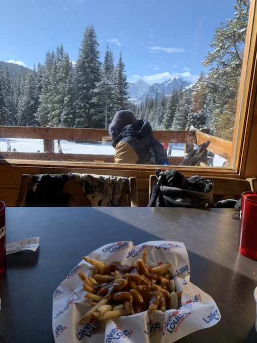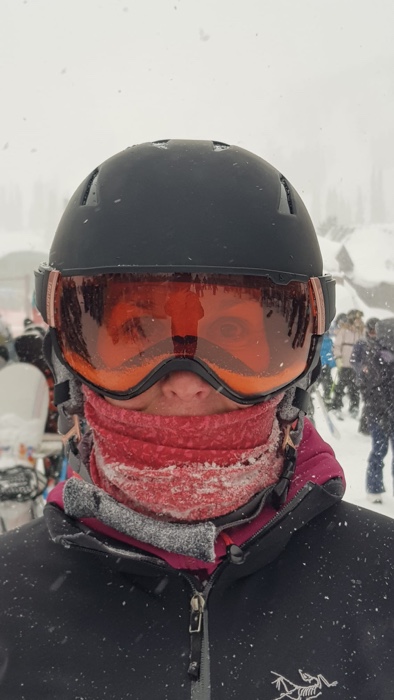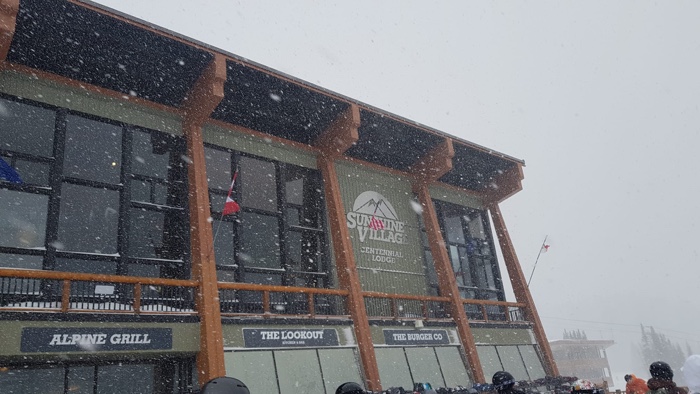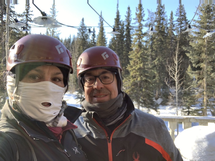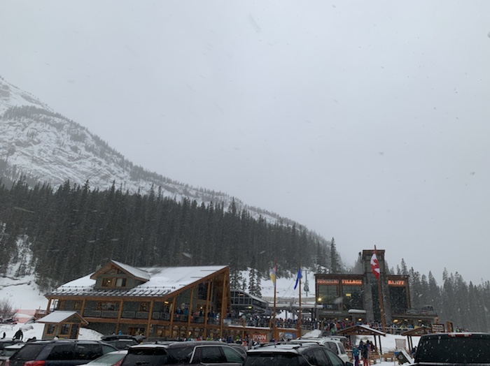 12h15 à Marmot Basin : Les skis sont loués, le pass acheté et nous nous équipons… dans la voiture! Il fait -21 sur le parking. J ai 5 couches pour le haut du corps, 3 couches en bas, les chaussettes chauffantes, la cagoule , deux couches de gants et bientôt aussi des chaufferettes pour les mains.