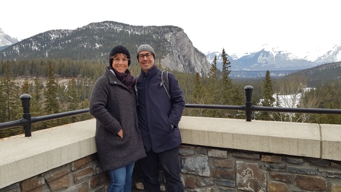 Réveil matinal ce matin pour prendre l avion pour Calgary. Puis départ en voiture de location pour Banff. Nous longeons les quartiers résidentiels de Calgary. Les maisons sont proches les unes des autres et se ressemblent passablement je trouve. Puis gentiment nous découvrons les montagnes mais d abord nous avons dû payer les droit du parc. Et comme nous restons 10 jours, nous avons directement pris un pass annuel. Le haut des montagnes et encore un peu dans les nuages. Je suis surprise par le peu de neige.
