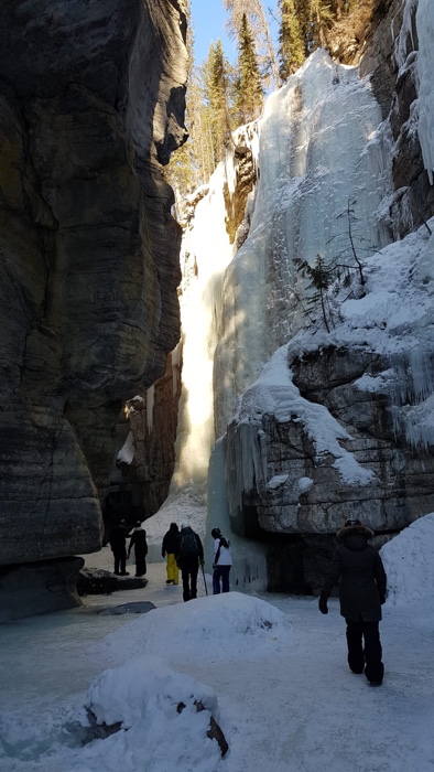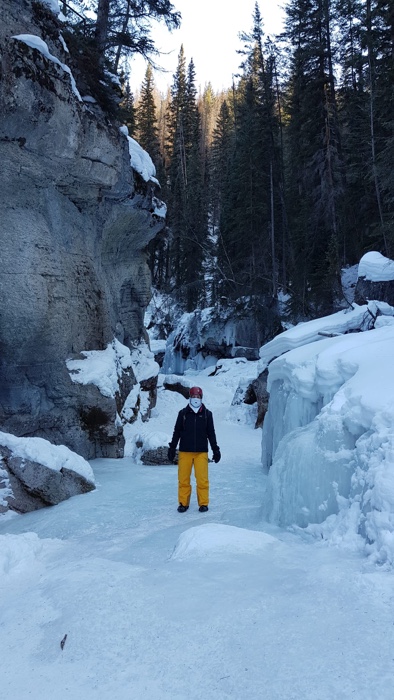 Mardi nous partons à la découverte du Maligne Canyon avec un tour guidé. On nous équipe de bottes de pluie fourrées, de crampons à glace ce qui au vu des chemins est obligatoire et d un casque.