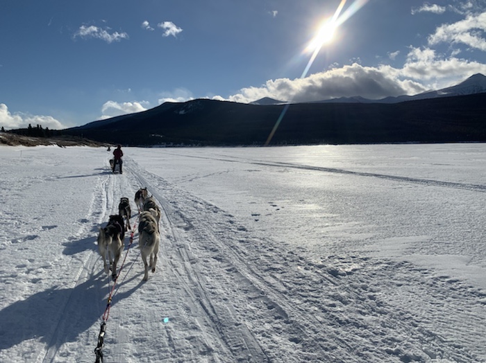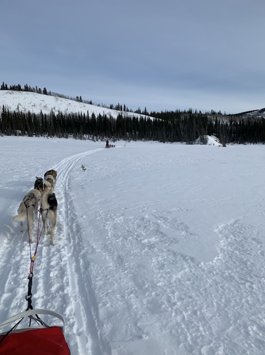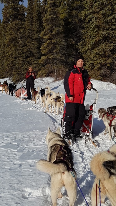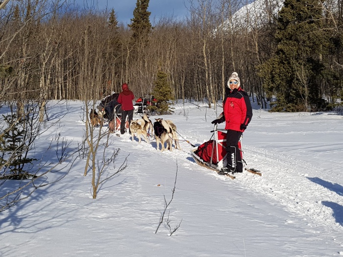 Nous avons de la chance, il fait grand beau. Nous voilà en route. Je découvre le maniement de la luge qui est tirée par 5 chiens. Nous traversons divers paysages- des forêts, le long d un rail, au bord d un lac, sur une rivière gelée- avant d arriver au campement où nous dormons les deux premiers soirs.
