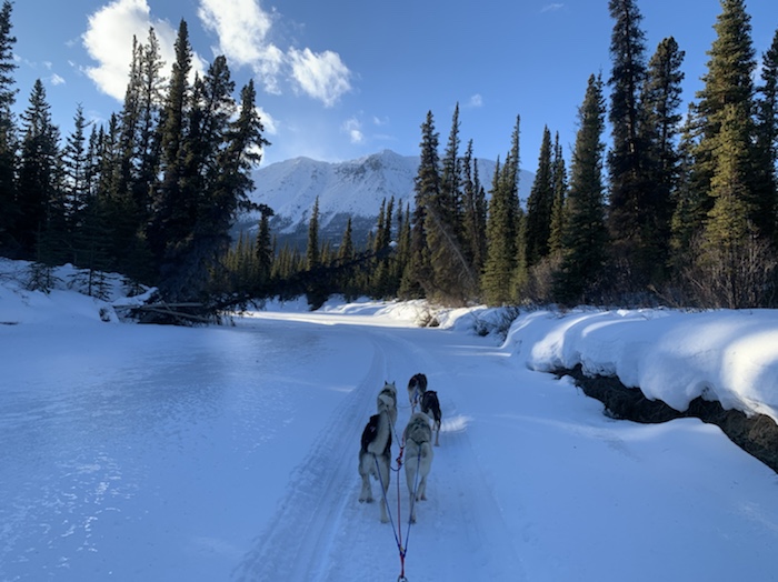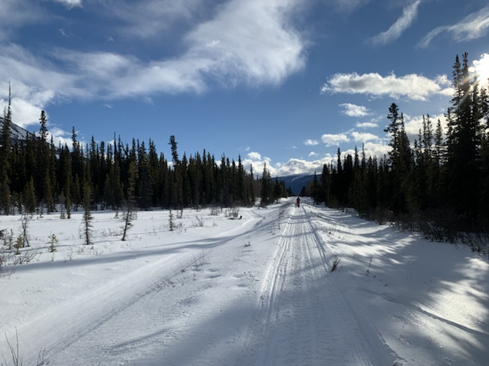 C est un trajet au milieu des arbres et des montagnes avec la rivière sur le côté. Celle ci est parfois complètement sous la neige, parfois des méandres apparaissent d un bleu turquoise au milieu de la plaine enneigée.