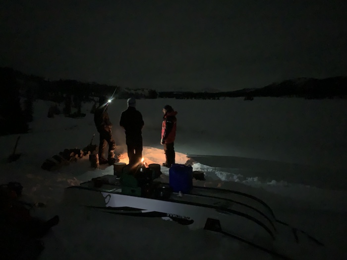 Le troisième jour, nous pactons toutes nos affaires car nous allons dormir plus au nord au bord d un lac. Le trajet est superbe. Le lieu de campement aussi. Simplement le poêle n est pas adapté pour la tente de voyage et nous n aurons que le feu de bois pour nous chauffer. C est l aventure. Heureusement il ne fait pas trop froid mais assez quand même pour que l eau gèle dans nos gourdes. Il doit faire autour de moins 15 je pense. Et chose à laquelle je n aurais pas pensé c est que le reste de la nourriture gèle aussi. Donc pas de sandwich le jour suivant car le fromage et le jambon ça gèle aussi. Bon ce n est pas très grave car de toute façon on aurait dû le manger pendant qu on conduit la luge.