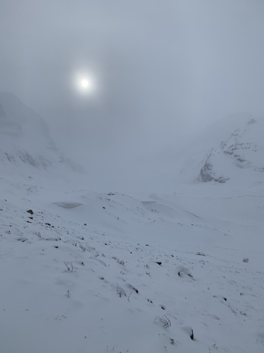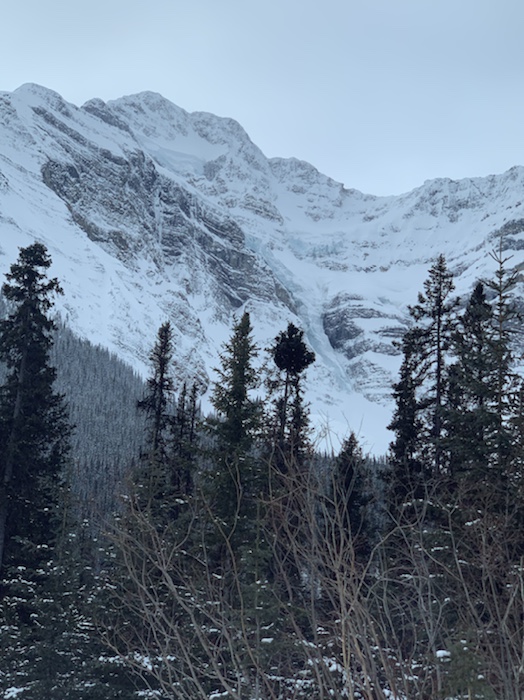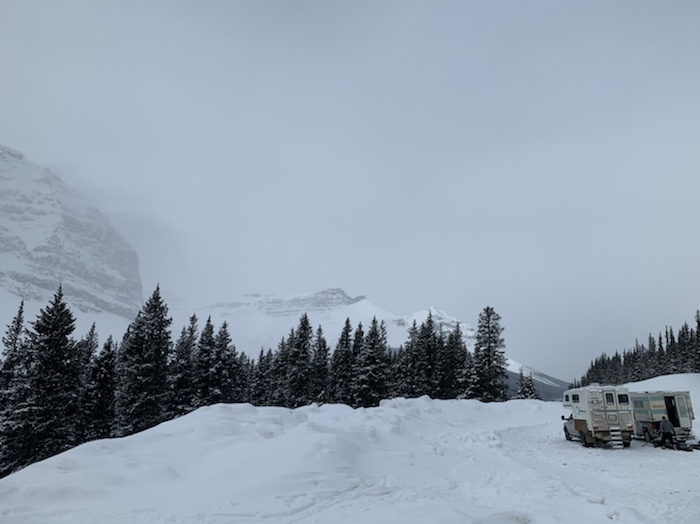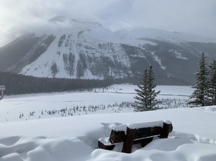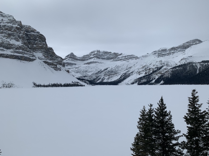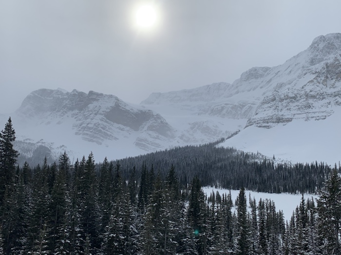 En hiver, tout est fermé mais en été il y a des arrêts partout, des sentiers et des campings. En hiver, il y a de temps en temps des voitures parquées en bord de route et des traces de ski de rando qui partent à côté. Nous nous arrêtons sur les rares arrêts dégagés et en profitons pour regarder la vue. Nous avons eu la chance d avoir une petite éclaircie vers le Bow Glacier.