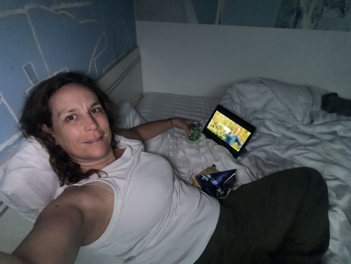En fin d après midi, je suis retournée a l eau avec ma planche et j ai glissé …. sur le ventre et a genou. Je n avais plus de force et le ciel un peu gris invitait plus a des séries Netflix.