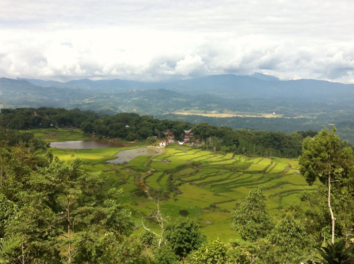 Nous avons fait 3 jours de trekking. Cela faisait du bien de changer d activité et de découvrir le pays autrement. Nous sommes partis au nord de Rantepao et sommes revenu au Sud ouest. Le guide nous a emmené à traverd les rizières, en évitant un maximum les grandes routes. Nous nous sommes souvent retrouvés entre deux terrains de rizière sur un petit chemin, une sorte de digue en terre large de trois largeur de pieds et parfois nous avons passe d une terrasse de riz à la suivante en se cramponant a l herbe et en découvrant des cailloux pour poser les pieds. C était très chouette de se retrouver comme cela au milieu des rizières, certaines très vertes d autres plutôt jaunes. Tout d un coup, il y a un t shirt rouge au milieu de tout ce vert : c est un enfant qui coupe de l herbe pour le buffle.