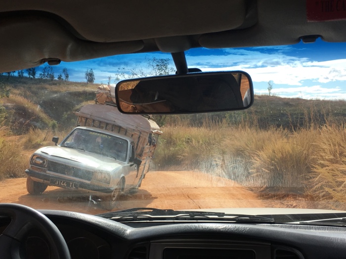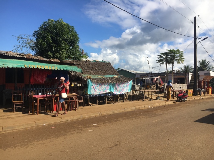 Le dernier jour de notre route, c est surtout de la voiture. Alors nous sommes sur une route nationale, la RN6, mais à part quelques tronçons intactes, c est une suite de trous plus ou moins grands. Parfois on roule à gauche, parfois à droite, parfois complètement à côté de la route, parfois à moitié sur la route à moitié sur le côté. On traverse les villages, et par régions ils se spécialisent dans quelque chose: les balais, les noix de cajou, les paniers tressés, …