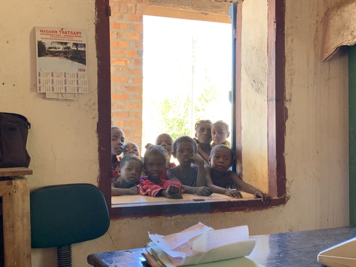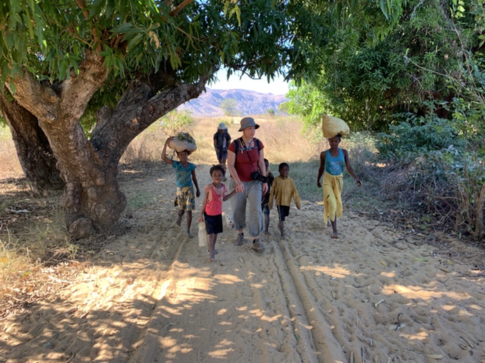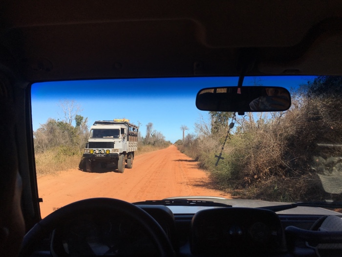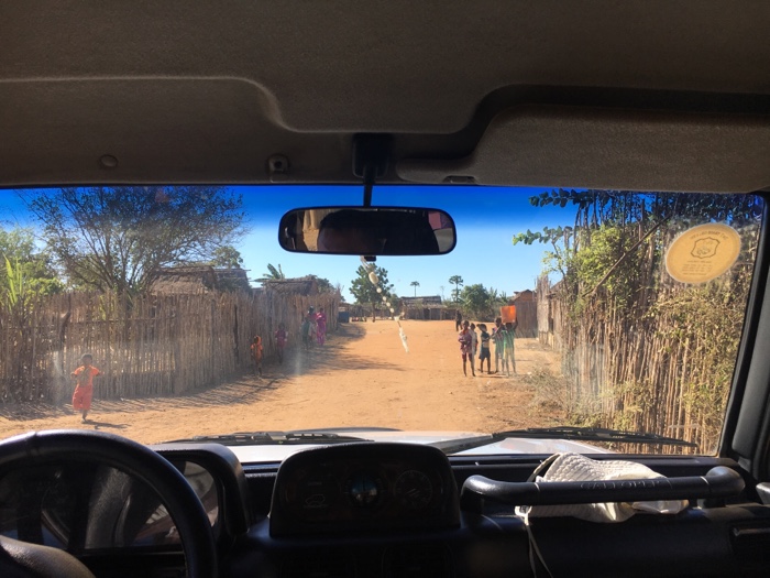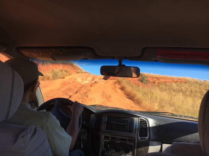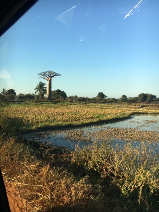 Et nous voilà à nouveau en voiture jusqu à Kirindy. Et bien sûr ce n est pas une route goudronnée mais que de la piste. Les routes passent de rouge au jaune sur très peu d intervalles. Parfois on avance dans un tunnel de forêt sèche d autre fois les cultures et rizière s étendent de chaque côté. Bien entendu nous passons aussi à travers des villages et croisons beaucoup de personnes sur le bord de la route.