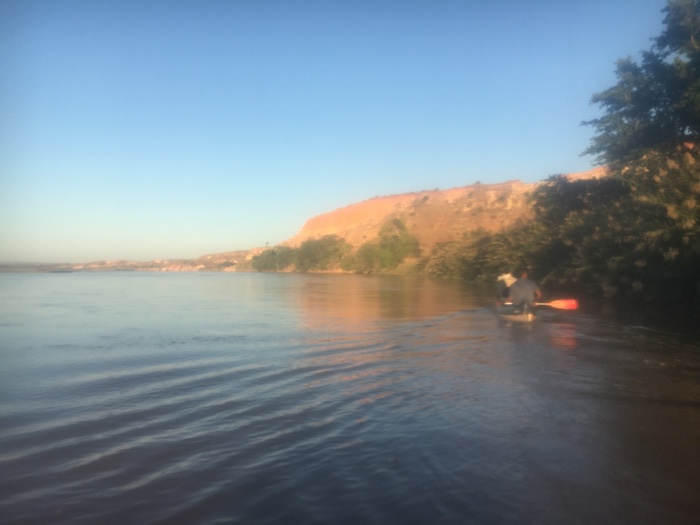 Après la pause de midi nous descendons jusqu à la rivière où nous attendent nos pirogues et nos rames. On va ramer tout l après midi ainsi que les 2 jours suivants. Le paysage du fleuve change lentement. Nous dormons sur des bancs de sables plus ou moins proche de villages, on se baigne, on assiste à la pêche, et on essaye de dormir avec le maximum de couches.