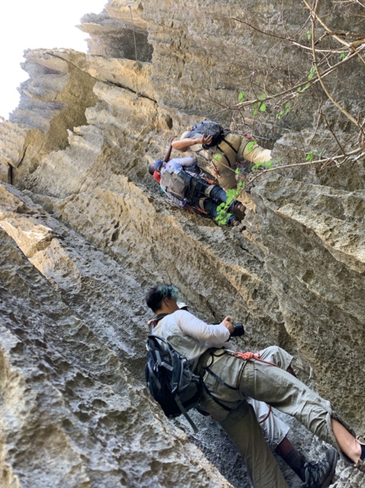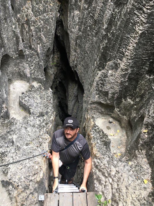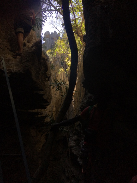 équipé de nos baudriers, nous entamons cette sorte de via Ferrarta qui nous amène au sommet des tsingys. On avance à la queue leu leu. La vue est superbe. Nous traversons tout un pan de montagne avant de terminer la boucle à nouveau dans la forêt. Le ciel est tout gris. Et nos guides s inquiètent pour l état de la piste s il venait à pleuvoir. Ce qui n est pas arrivé.