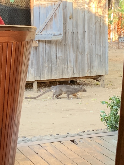 A Kirindisy: c est une forêt sèche qui abrite certaines espèces de lémuriens et le Fosa. Nous avons fait une visite nocturne et avons eu l occasion de vraiment bien voir le microzebu le plus petit lémurien et une visite diurne le demain matin suivant lors de laquelle on a vraiment bien vu les lémuriens blancs, les plus grands et le marron. Et le Fosa est venu nous dire bonjour plusieurs fois au camp. Ensuite on a fait connaissance avec notre chauffeur qui nous conduit jusqu à Morondava. Ça y est, on est au bord de l océan. On profite de l hôtel, je me balade sur la plage et on se pose tranquille le soir pour un petit rhum arrangé.