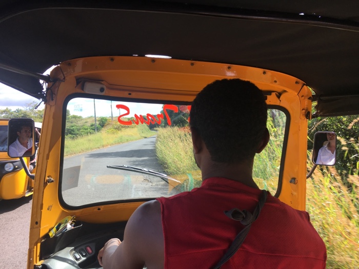 C est en tuktuk que nous avons fait le tour de l île ensuite. Comme l a dit notre conducteur Patrick : maintenant commence le guide. Il nous montre Hellville, nous explique son île puis nous allons en direction de l est. Nous montons en hauteur et passons à très d immenses champs de ylang ylang, passons à côté de distilleries dont certaines très artisanales. Finalement nous nous posons à Andilane sur la plage en attendant de monter au Mont Passot pour le coucher de soleil.